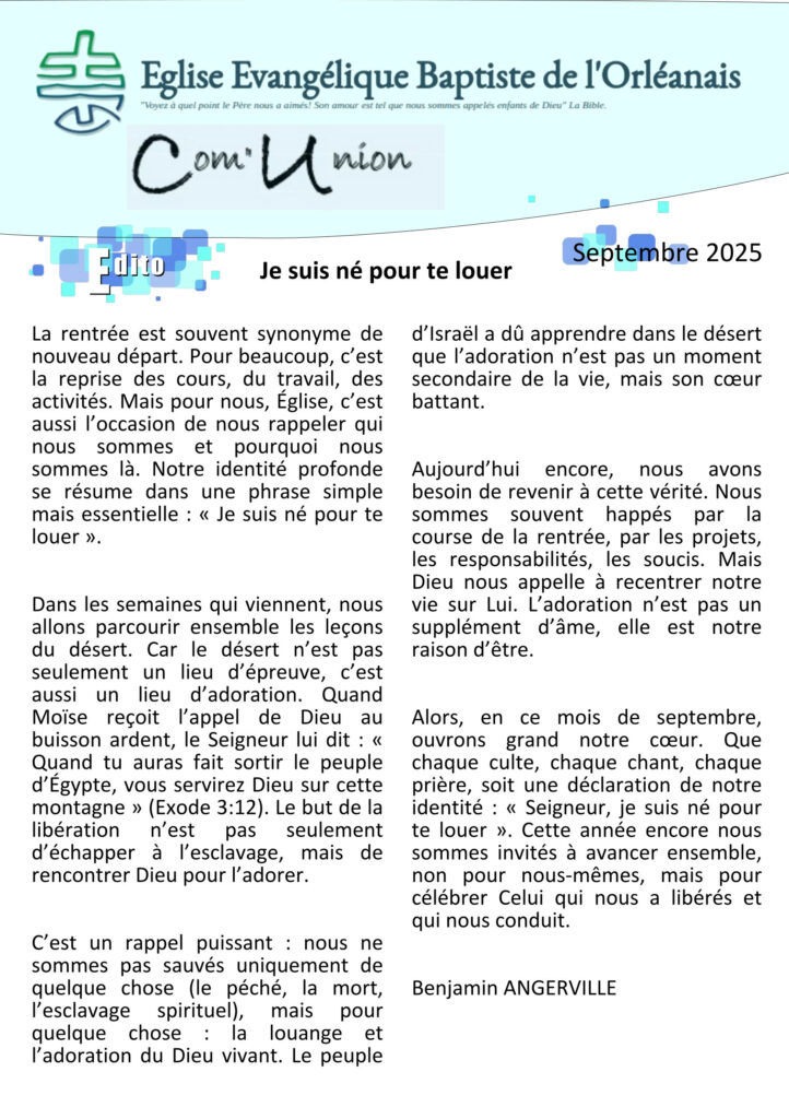 Programme de léglise Programme de léglise Vous avez la possibilité de télécharger les programmes de l’église.Ceux-ci sont classés par ordre chronologique inverse. Bulletin de Septembre 2025 – Benjamin Angerville Je suis né pour te louer